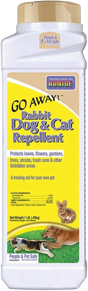 Keep animals away with Go Away! Rabbit, Dog & Cat Repellent Granules! This product is intended for outdoor use – great for lawn & garden, flower beds, trees, shrubs and other areas. Natural ingredients cinnamon oil and thyme oil act as a natural deterrent to keep animals away. When used as directed, this product is safe for use around people and pets. Go Away! Granules work as a training aid for your pets and stray critters in your yard. This product arrives conveniently packaged and ready to use! To use, lightly ad evenly sprinkle a band of 4 feet wide around the area you wish to protect.