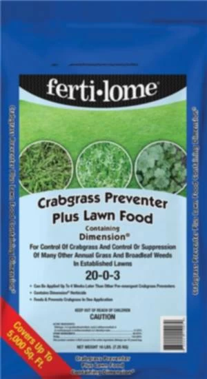 Crabgrass preventer plus lawn food containing dimension ® controls crabgrass and controls or supresses many other annual grass and broadleaf weeds in established lawns. Can be applied up to 4 weeks later than other pre-emergent crabgrass preventers contains dimension ® herbicide feeds and prevents crabgrass in one application coverage: 5,000 sq. Ft always read and follow label directions.