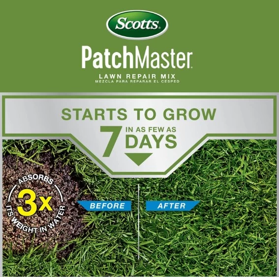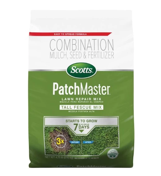 Scotts® PatchMaster® Lawn Repair Mix Tall Fescue Mix comes pre-mixed to make repairing bare spots easy! This product contains a mixture of premium Tall Fescue seed to blend with your existing lawn, 100% recycled mulch to help keep seeds moist and in place, and fertilizer for fast growth and thick results. In fact, this mix starts to grow in as few as 7 days, feeds up to 6 weeks, and absorbs 3x its weight in water! Apply in the fall or spring when daytime temperatures are between 60°F and 80°F. Evenly spread a thin layer of PatchMaster® Lawn Repair Mix so the area is completely covered. A deep and thorough initial watering is the key to success. Gently water the area until PatchMaster® is completely saturated and no more water is being absorbed. Continue to water daily or more as needed to keep the soil moist. One 4.75 lb. bag of Scotts® PatchMaster® Lawn Repair Mix Tall Fescue Mix has a bare spot coverage of 70 sq. ft. and a thin grass coverage of 140 sq. ft.