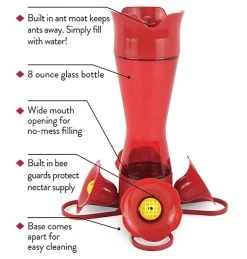 Bring bold color and convenient design to your backyard bird-feeding routine with the Perky-Pet Pinch-Waist Red Glass Hummingbird Feeder. Offering the classic silhouette you know and love, this 8 oz feeder now features a bright red bottle, cap, and base to capture the attention of hummers from near and far. The wide-mouth bottle, simple disassembly, and insect defenses all combine to make this our most convenient feeder for birders of any experience level. Find the best seat in your house now, because hummingbirds are sure to be on their way!