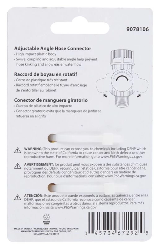 Swivel coupling and adjustable angle help prevent hose kinking and allows easier water flow. High impact plastic body.