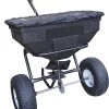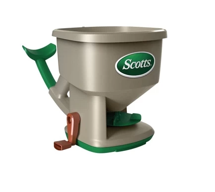 Holds up to 1,000 sq ft of product. Tapered hopper for improved product flow. New setting dial makes changing settings easier. Rounded handle and arm support coming from the bottom for greater comfort. Larger grip makes cranking easier.