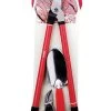 Steel handles with cushion grips. 6 in high carbon steel blades with tension adjuster. Heat treated blades.