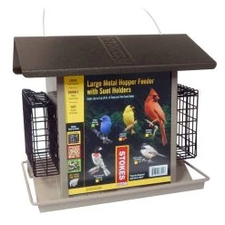 The Stokes Select® Large Hopper Bird Feeder with Suet Holders is engineered with the best features for bird feeding enthusiasts. The large hopper lives up to its name with a supersized seed capacity of 8 lbs., in addition to its 2 easy-to-open suet cake holders. This sturdy metal feeder includes a built-in socket to mount to the Stokes Select® Bird Feeder Pole. Its large perching area provides space for multiple birds to feed simultaneously. The roof design helps keep seeds dry from rain and snow, while its built-in seed diverter and drainage holes help keep seeds fresh. With a weather-resistant Moccasin & Hammered Copper finish and durable metal and plexiglass construction, the Stokes Select® Large Hopper Bird Feeder with Suet Holders is the ideal feeder for attracting a wide variety of birds to your yard.