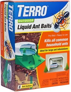 Terro® Outdoor Liquid Ant Baits attract and kill common household ants. To use this outdoor liquid ant bait, simply place the pre-filled, ready-to-use liquid bait stations outdoors in areas where ants are observed and, if desired, secure the baits with the stakes provided. The patented outdoor ant baits prevent the liquid bait from drying out, providing the ants with a continuous supply of food, day and night. Ants typically follow defined trails from the nest to food or water. Placing the outdoor ant baits close to these trails will improve control.