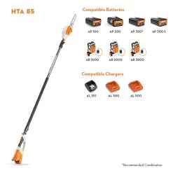 Homeowners and tree care professionals now have a quiet, zero-exhaust emission, low vibration option for trimming overhead branches. The STIHL HTA 85 Lithium-Ion battery pole pruner offers lightweight, balanced cutting thanks to its brushless, commercial-grade, high-torque electric motor. Part of the STIHL battery-powered line, the HTA 85 runs on the same interchangeable battery system as other STIHL Lithium-Ion tools and offers long runtimes ON A SINGLE CHARGE™ up to 3 hrs depending on which battery with no gradual drop in performance. The HTA 85 telescopes to 12 ft for those tall tree-trimming tasks and requires minimal maintenance since it has no engine or filter. Finest of all, there’s no gasoline cost and no restrictive power cords. Batteries and chargers can be purchased separately.
